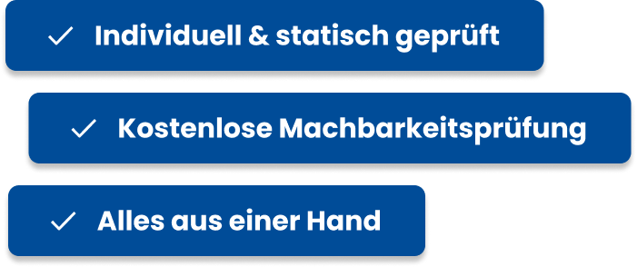 Unsere Projekte starten bei 8.000 €. Der finale Preis richtet sich nach Größe, Konstruktion und Ausstattung. Mit unserem kostenlosen Check bekommst Du schnell eine realistische Einschätzung für Dein Vorhaben.